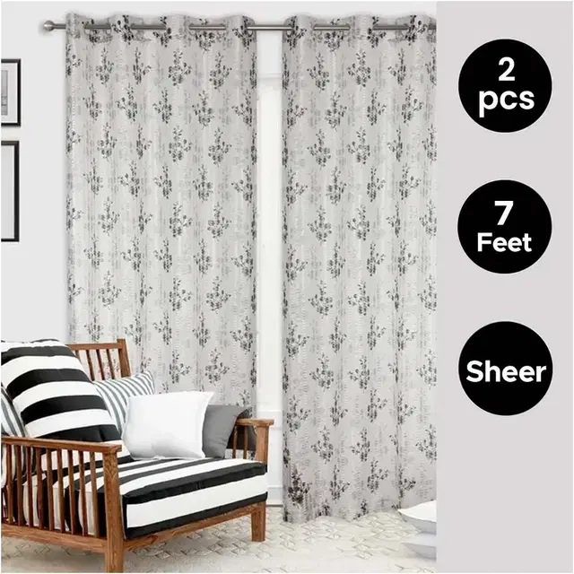 Sheer Floral Branches Printed Grey Door Curtain 7ft Combo (Pack of 2)