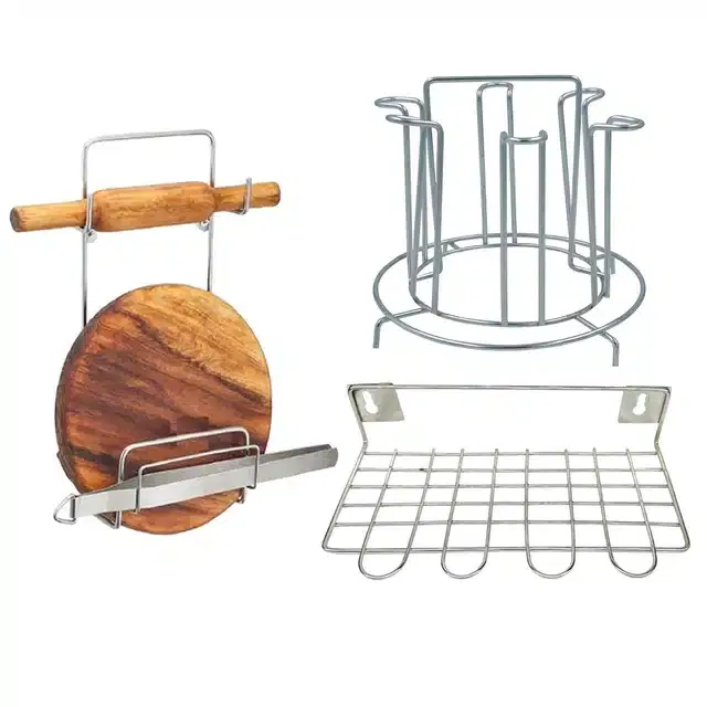 Stainless Steel Glass Stand & Utensil Holder with Chakla Belan Stand, Set of 3, Silver - Buy Online at CityMall