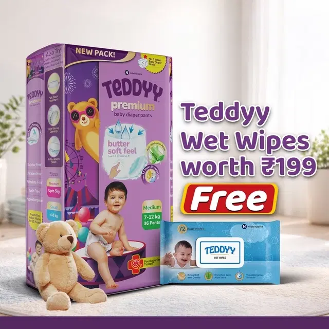 Teddyy Premium Baby Diaper Pant Style (Medium) 36 Pcs + Free Teddy Wet Wipes (With Lid) 72 Pcs @ ₹279 - Buy Online at CityMall