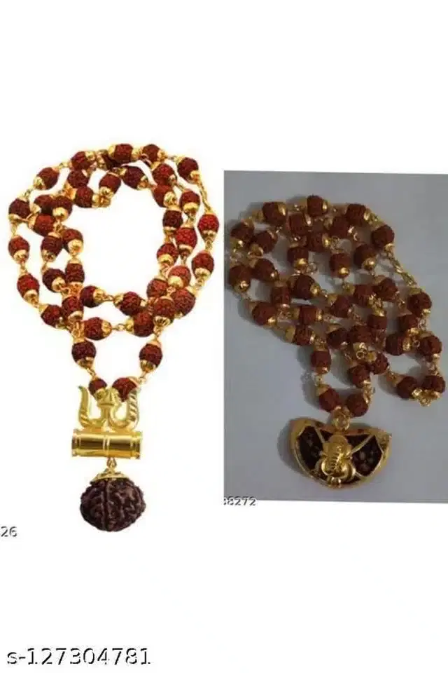 NaName: rudraksha trishul damru $ ganesh kaju mala Puja Articles Type: Rudrakhsa Pooja Jap Mala Net Quantity (N): 1 Color : Brown & Gold , Material : Wooden Country of Origin: India