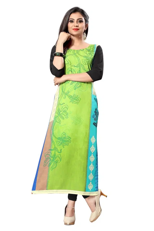 • Material: American Crepe • Occasion: Casual & Festive || Sleeves: 3/4 Sleeve• Style: Straight || Kurti Length (Shoulder to Bottom hem) 44 inches• Front Side Print (Back Side Plain) Straight Kurta• Bust Sizes: Small(36), Medium(38), Large(40), X-Large(42), XX-Large(44) {in inches}• Care: Wash Separate with good detergent || Note: Product colour could be diffrent due to Desktop or Mobile Brightness