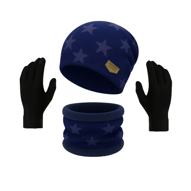 Blue Woolen Winter Star Design Print Cap With Neck Warmer and Gloves for Men and Women