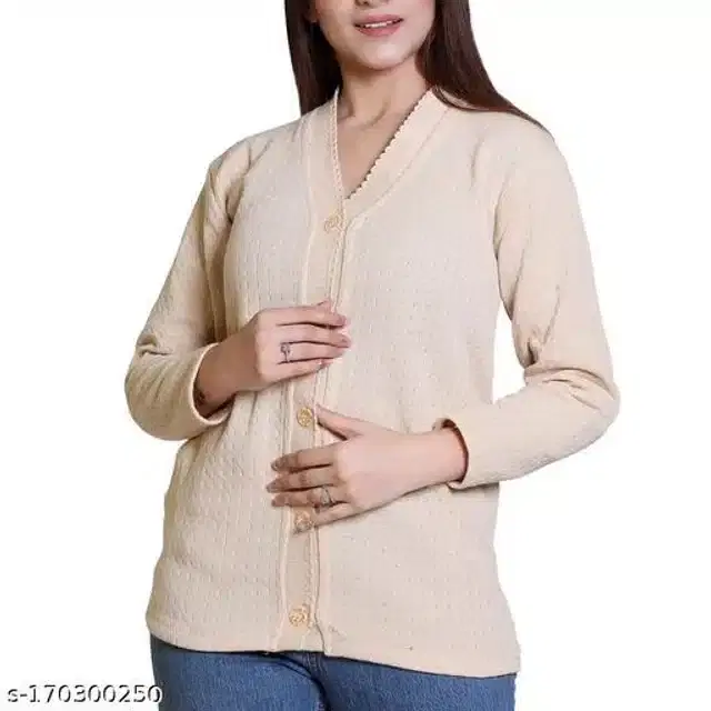 Woolen Solid Full Sleeves Cardigan for Women (Cream, XL)